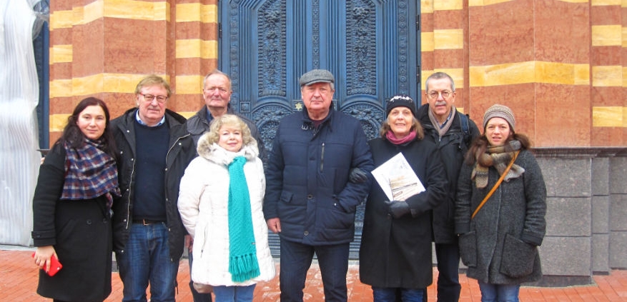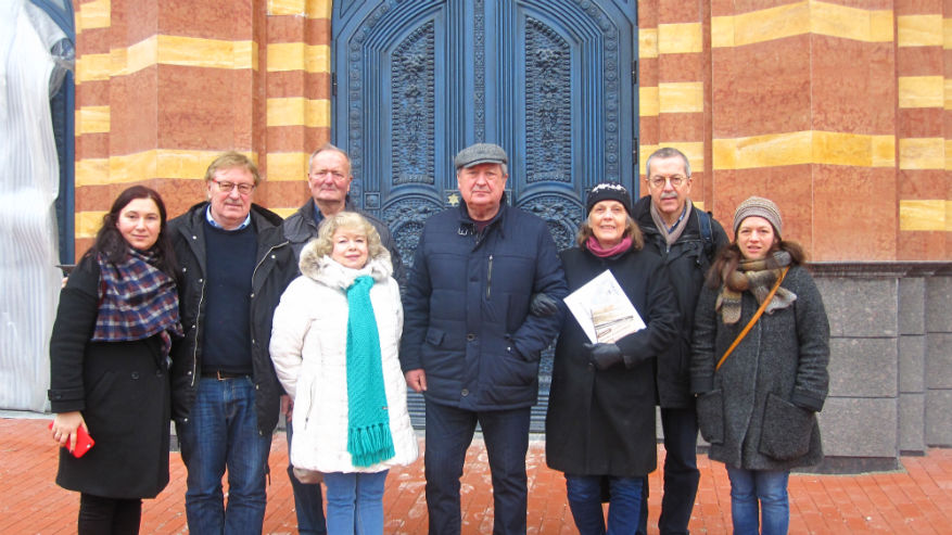 Höhepunkt der Stadtrundfahrt, so dann das Treffen mit Leonid Pliman vor der „Neuen Kaliningrader Synagoge“. Erfolgreicher Unternehmer, beharrlicher Wiederaufbau-Visionär für die vom Nazi-Regime während der Novemberpogrome 1938 zerstörten – an gleicher Stelle gestandenen – 1896 eingeweihten – früheren Synagoge.